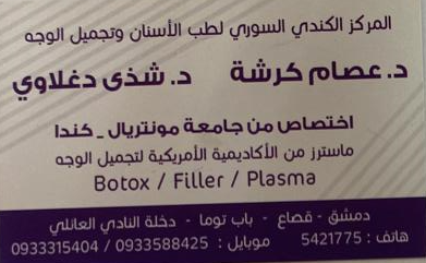 د. عصام كرشه د.شذى دغلاوي اختصاص من جامعة مونتريال - كندا ماسترز من الأكاديمية الأمريكية لتجميل الوجه Botox / Filler / Plasma